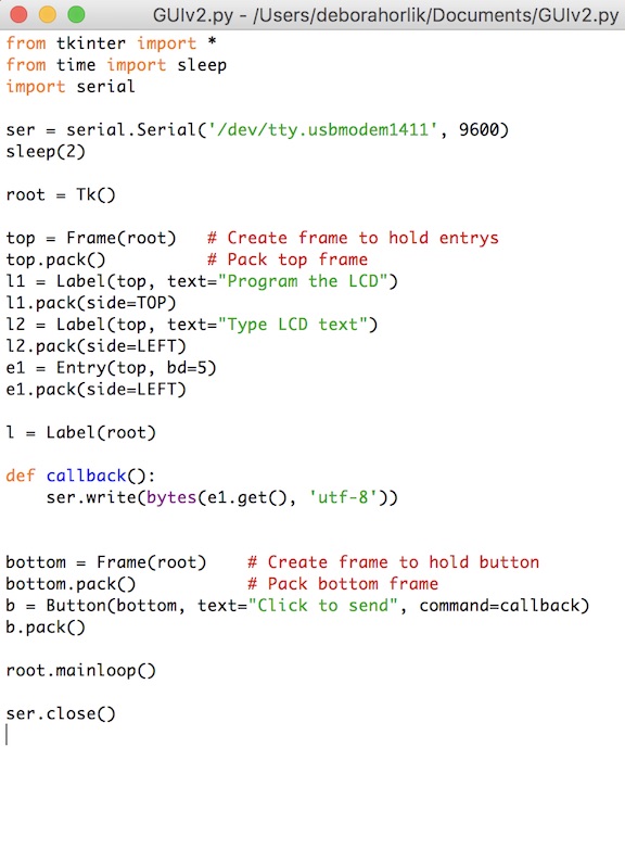 from tkinter import * root = Tk() top = Frame(root) # Create frame to hold entrys top.pack() # Pack top frame l1 = Label(top, text="Program the LCD") l1.pack(side=TOP) l2 = Label(top, text="Type LCD text") l2.pack(side=LEFT) e1 = Entry(top, bd=5) e1.pack(side=LEFT) l = Label(root) def callback(): x = e1.get() print(x) bottom = Frame(root) # Create frame to hold button bottom.pack() # Pack bottom frame b = Button(bottom, text="Click to send", command=callback) b.pack()
