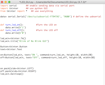 As a fall-back, I wrote a little GUI to communicate with a blinky board I built for Embedded Programming week. The GUI to speak to that board with an LED looks like this: