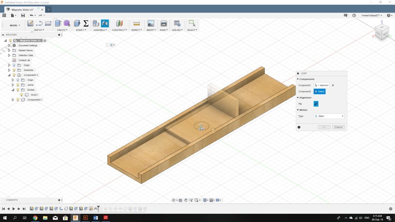 I want to make a slider joint, so I selected the type of the joint I want to create first, then selected the surfaces that I want to be sliding on each other and finally selected the sliding axis.