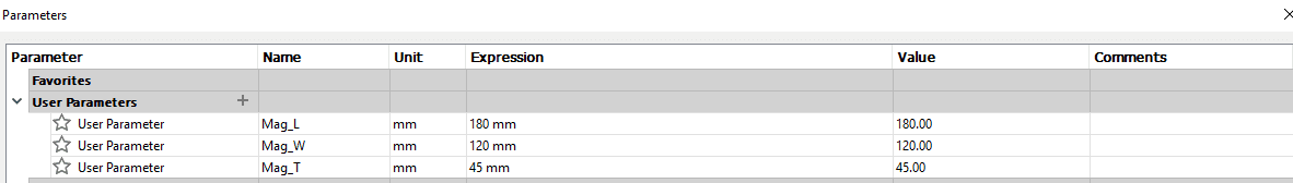 Clicking on it, will pop up the parameters table. Here we add the parameters that are going to restrict our design. In my case, the dimensions of the magnets are the restrictions because those will depend on the magnets available in the market. So I named three parameters for the length, width and thickness.