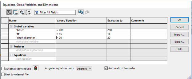 Let's now to try the parameters, go again to Equations>Manage equations. And change any of the variables then check the Auto Rebuild box and click OK.