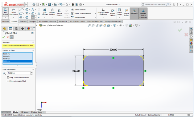 Another sketching tool is called fillet, click it then select the corners you want to apply it to and select the radius.
