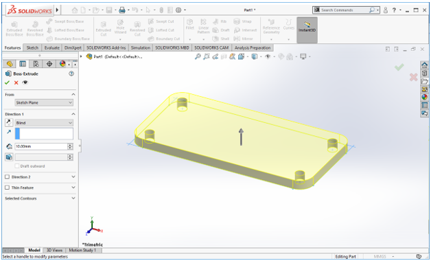 After finishing the sketch, click stop sketching. Now for extruding the sketch, click create, and select the distance.