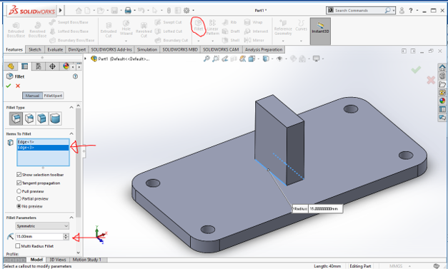 We can add fillets the same way we did in the sketch, by selecting the edges and the radius: