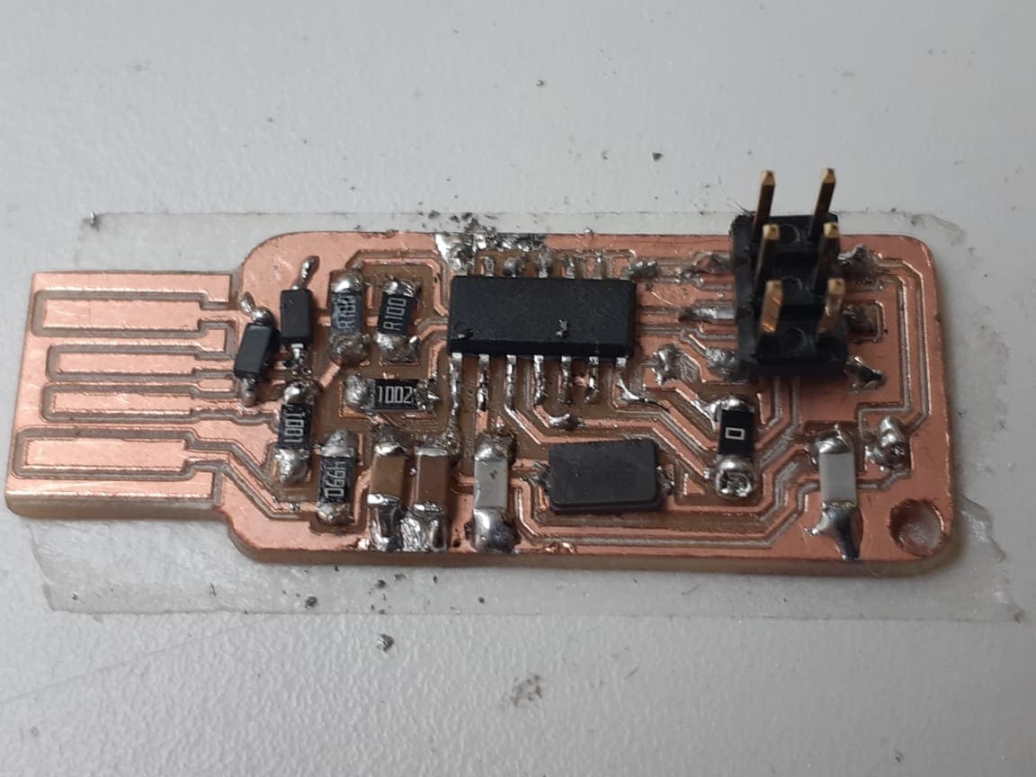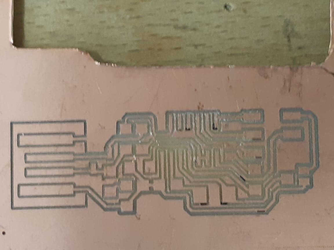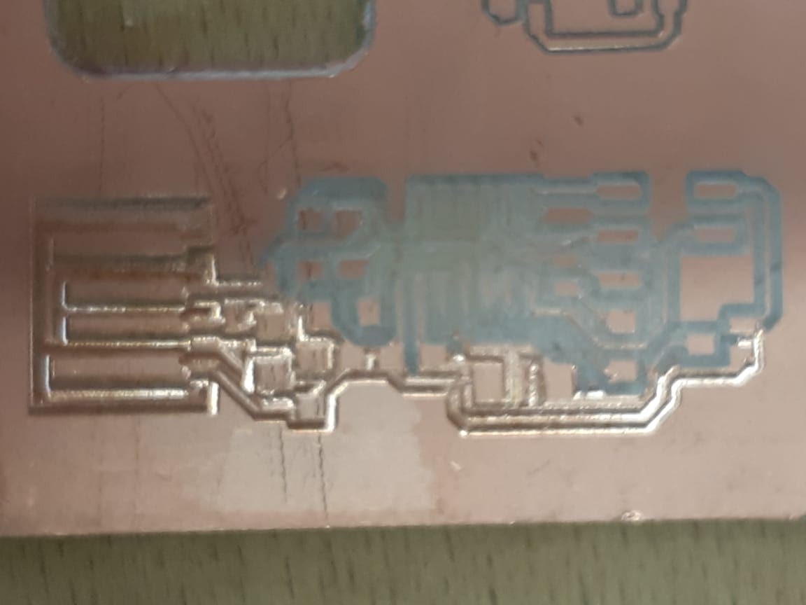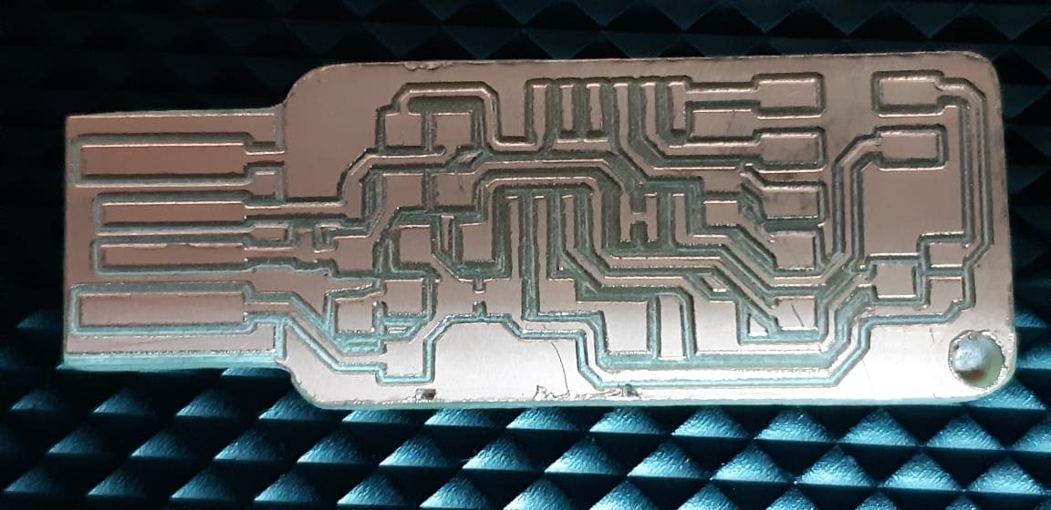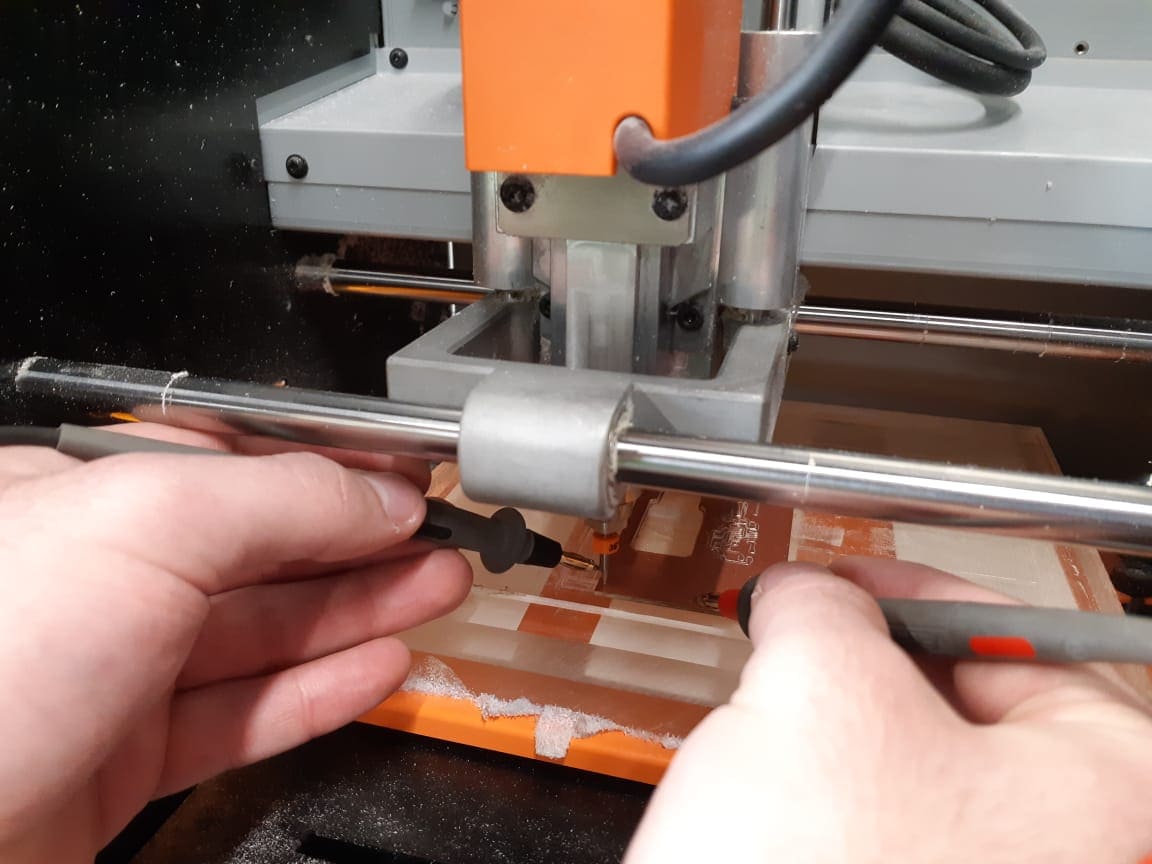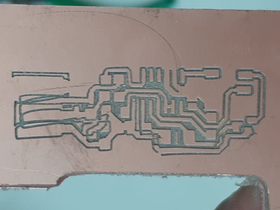 This first trial was perfect, except at some point, the tape failed to constraint the chip to the bed and it started moving under the end mil, which caused the tracing to corrupt.