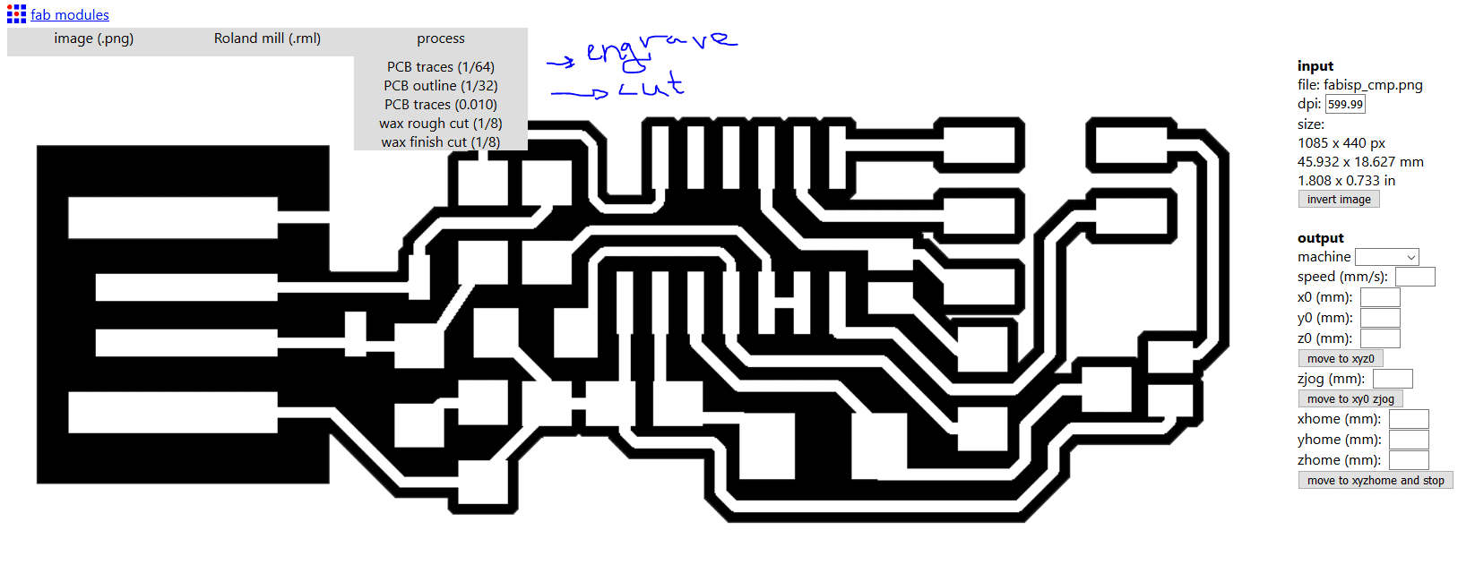 For this week, the design was given to us and we had to manufacture it using the milling machine. Two pictures were given, one for engraving the ISP lines, and the second one is for cutting the outline of the ISP.