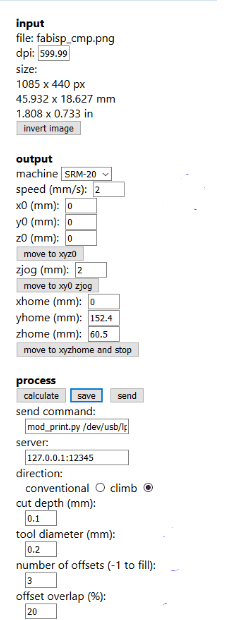 After that, on the right side bar, we select the settengs we want; the machine type, the cutting speed (the slower the better for the mill maintenance), the cutting depth, the tool diameter, the number of offsets and their overlapping.