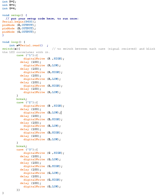 As you saw in the picture, I defined three functions to send three different signals. Then on the Arduino code, which is very similar to the Networking code, I created three conditions with the three signals. Each lighting an LED colour.