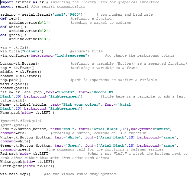 When defining a button, we name the button then use the reserved word, tk.Button() and inside the brackets, we deifne the appearance of the button and the text it contains. And finally, we connect the but on to a previously created function. And the functions in my case are about sending a signal to the Atmega board.
