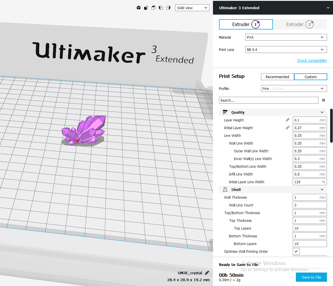 Then for 3D printing, I used Ultimaker 3, bacause on Cura, it is compitable with the PVA material unlike Ultimaker 2+.