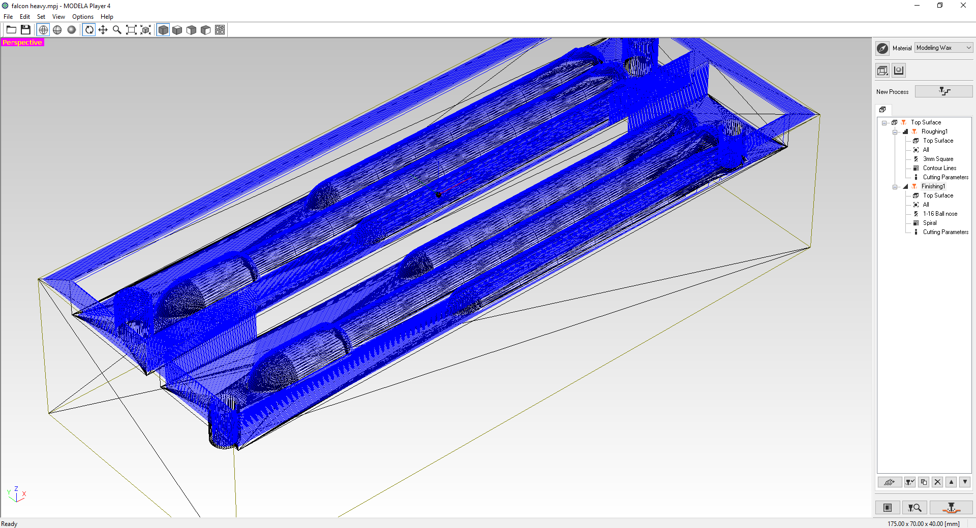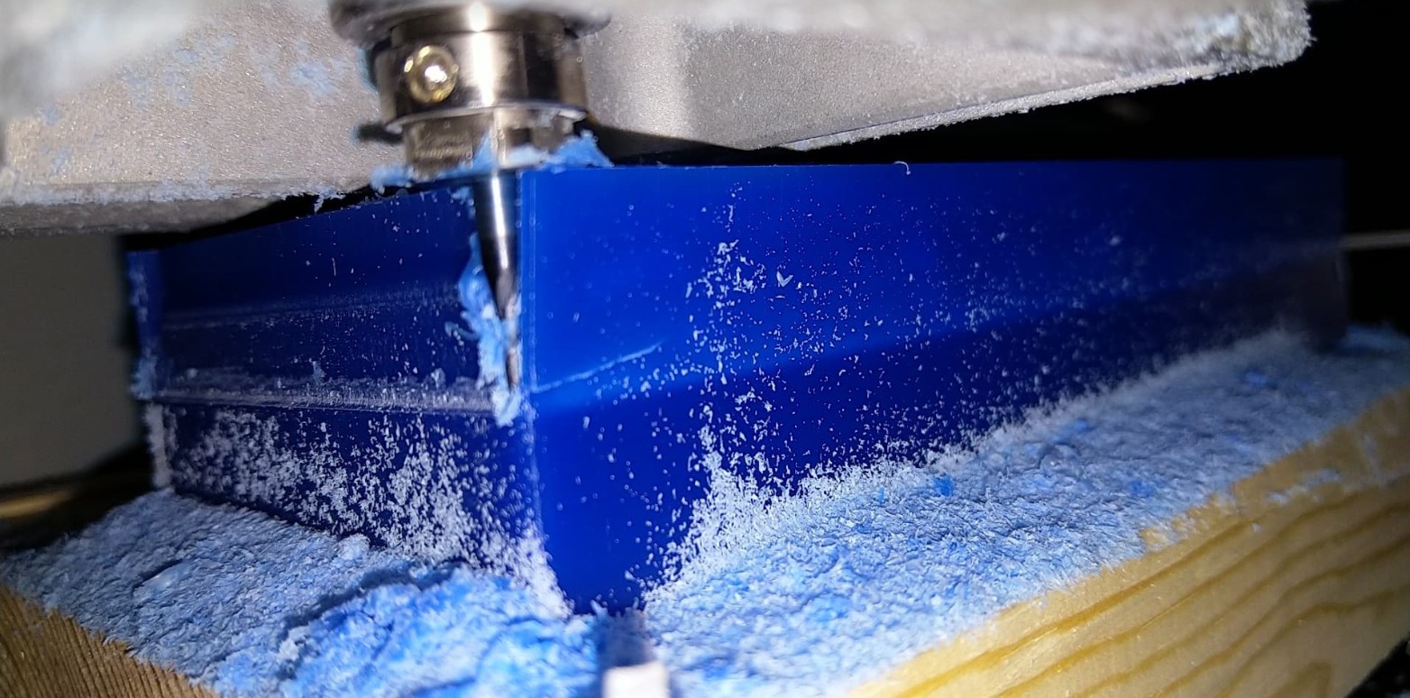 The milling went in two stages: the first one for material removal, using 1/8 inch square end mill. and the process took 4 hours. The second one was for smoothening, using 1/8 inch ballnose end mill. The latter took about an hour.