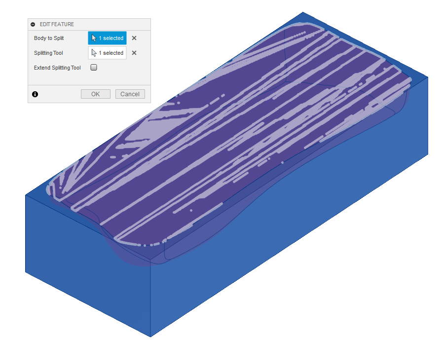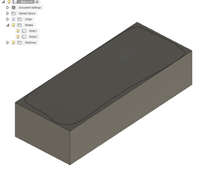 Then I took the negative of that by the Split Body tool from Modify. But first, to do so, I had to create a different cuboid that contains the blob. Then spit them from each others.
