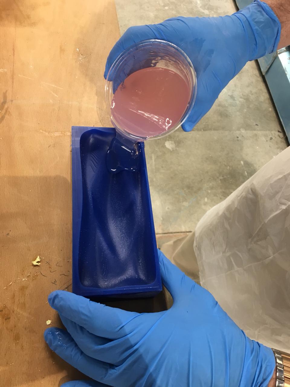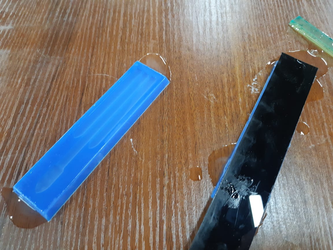 After mixing equavilant amounts then pouring them carefully, I placed a flat plastic bar on of the mold to ensure a straight surface.