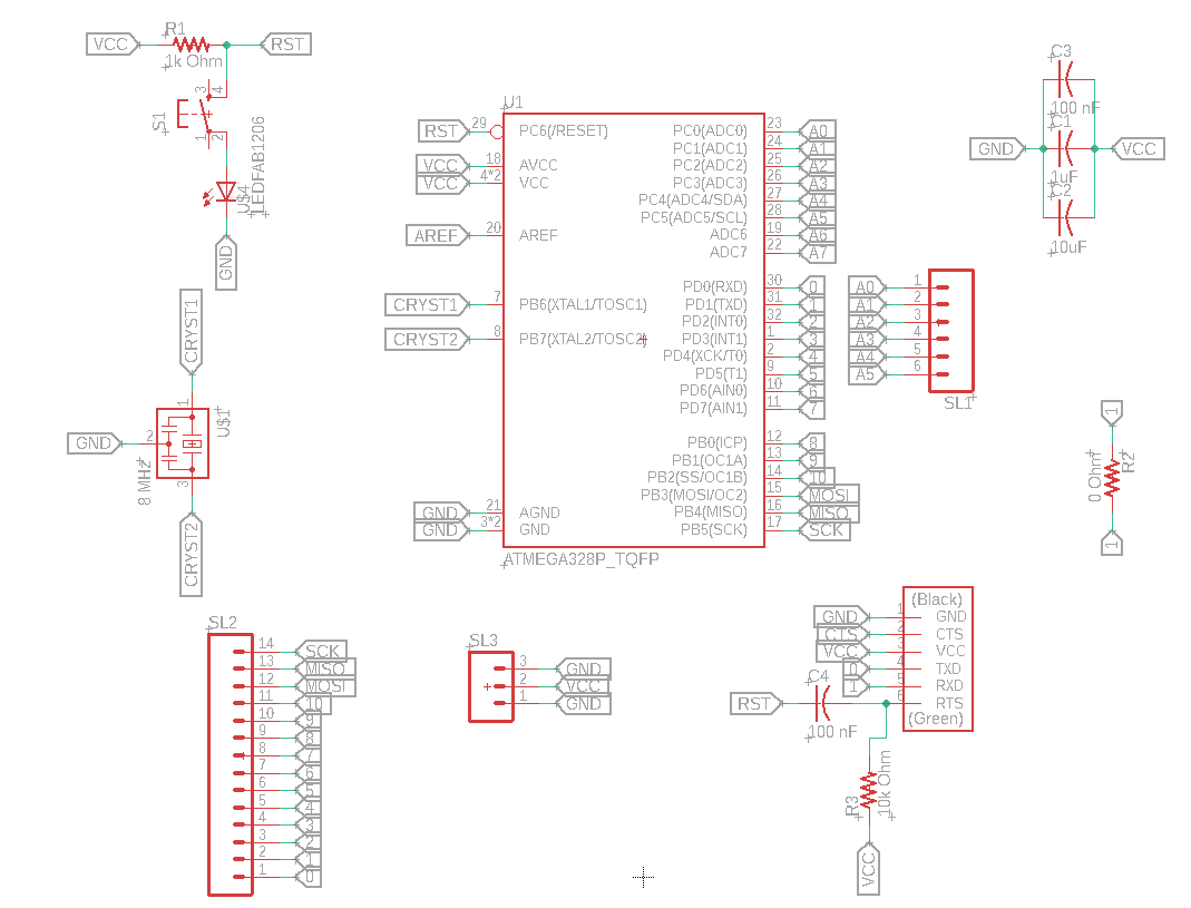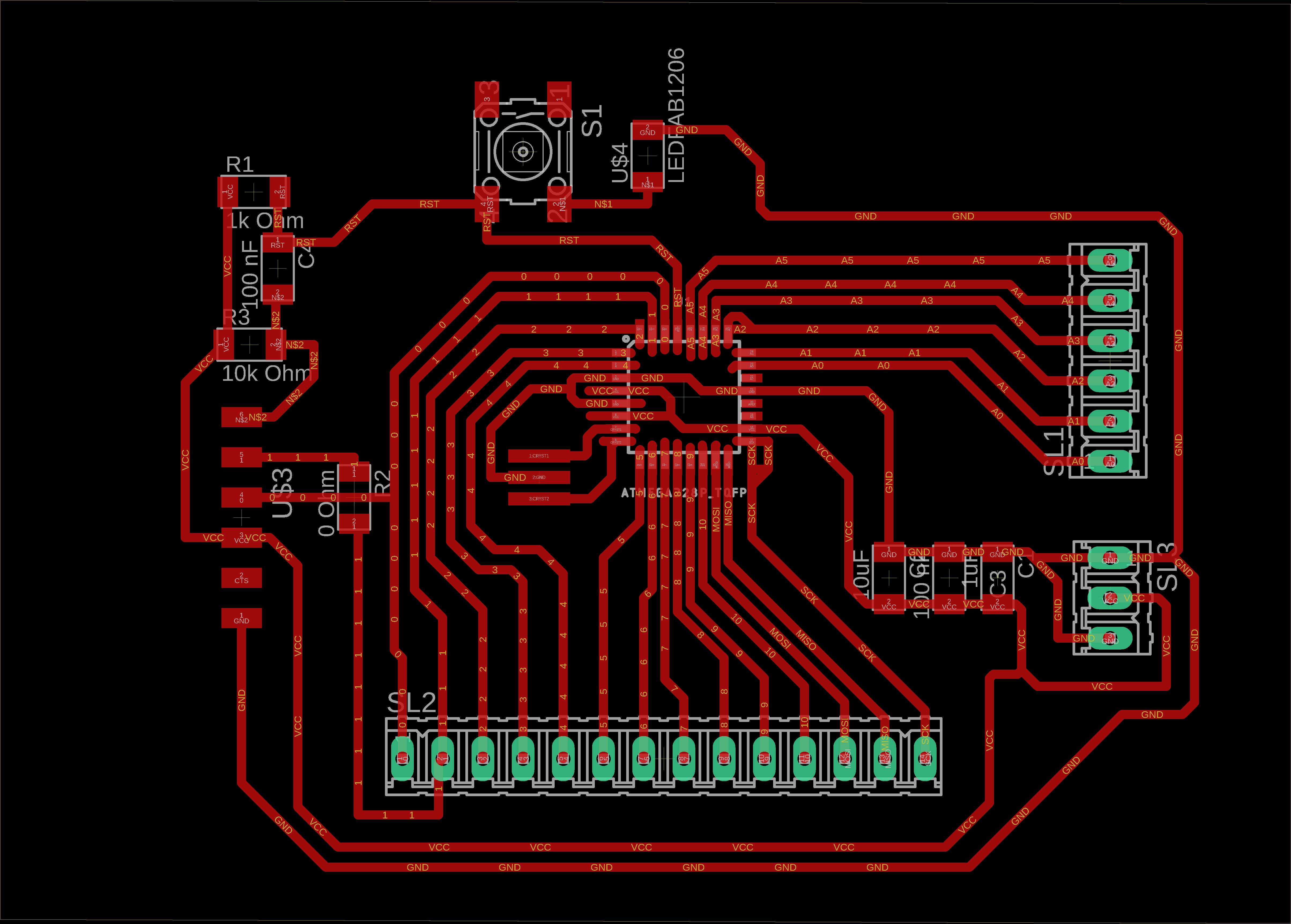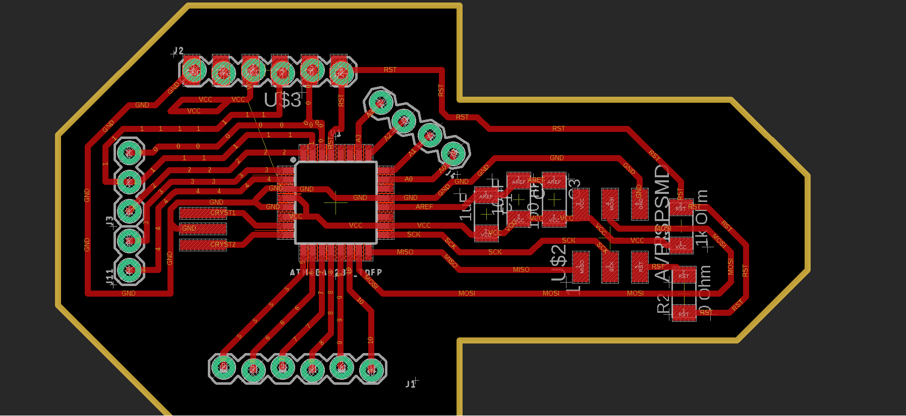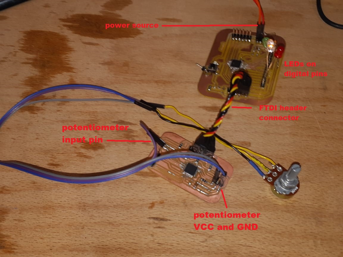 For this week, we are supposed make two boards of our creation communicate with each other, so what I used my Atmega board that is used for my final project to connect it with a new Atmega board. The final project board is going to take an input signal controlled by a potentiometer. And the other board is meant to light three LEDs of different colours depending on the value of the signal read.