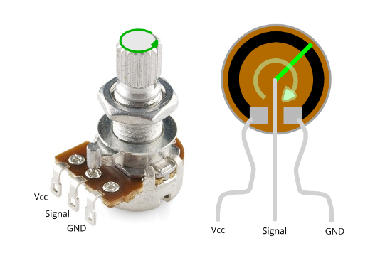 A potentiometer, is a resistance device with three terminals, two termenals are connecting to the high and low voltage, and the middle terminal, which is controlled manually with a rotating pin, is used as a voltage divider, so the output signal would vary as the placement of the terminal.