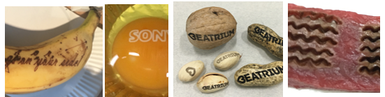 Laser decoration for food such as cookies is very cute. Lots of trials are on the net, and I also tried many types of food. However the reason why it doesn’t spread wide is the decoration is not delicious, I think. Since laser makes it bitter, only sweet cookies with sweeeet cream sandwiched suits for the engraving. During my rapid trial, I found that nuts and bananas are good material because engrave on shell, skin does not affect inner stuffs. And also engraving ‘texture’ onto raw food is interesting for me. It will affect taste and feel when eating. -