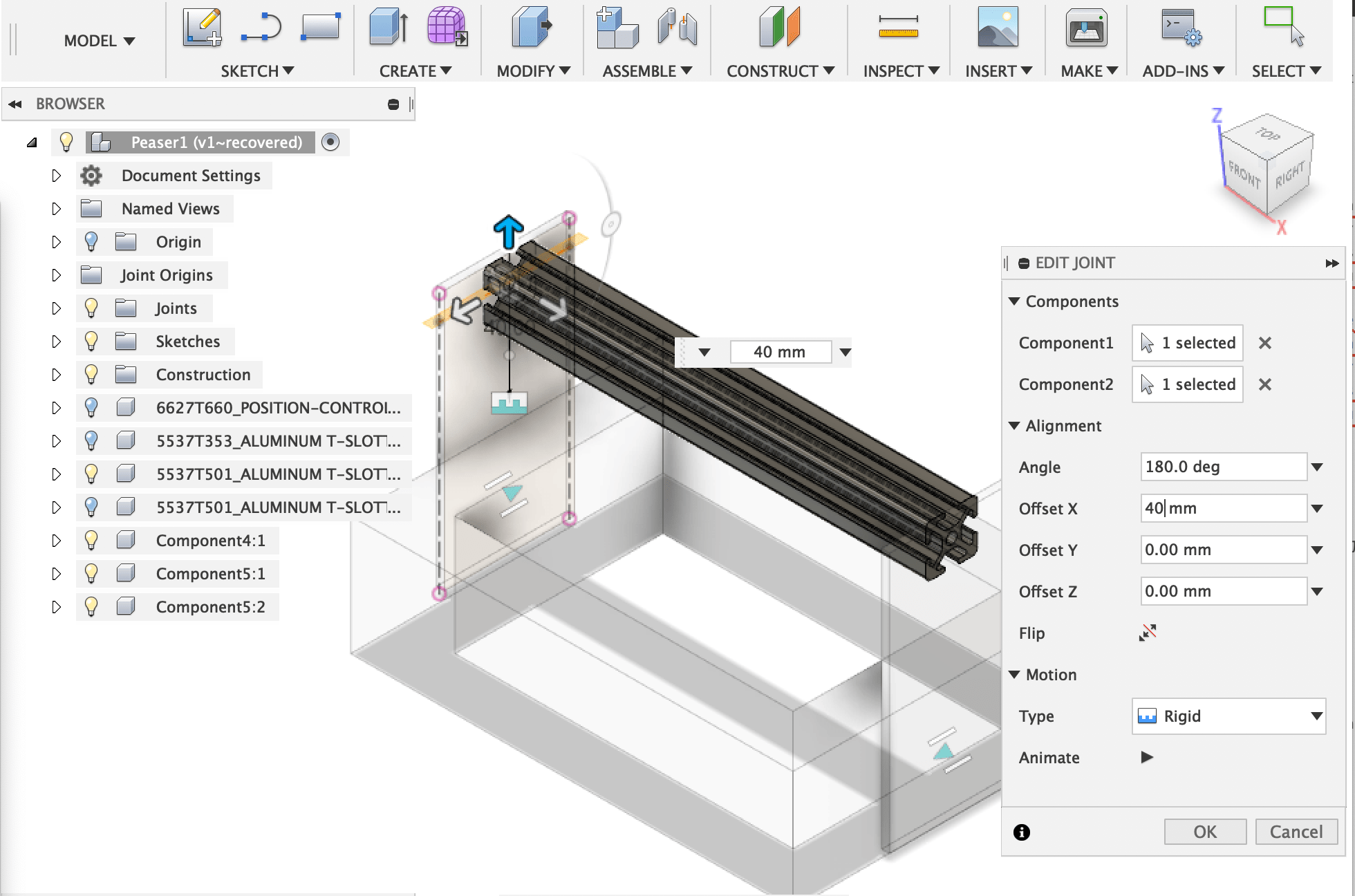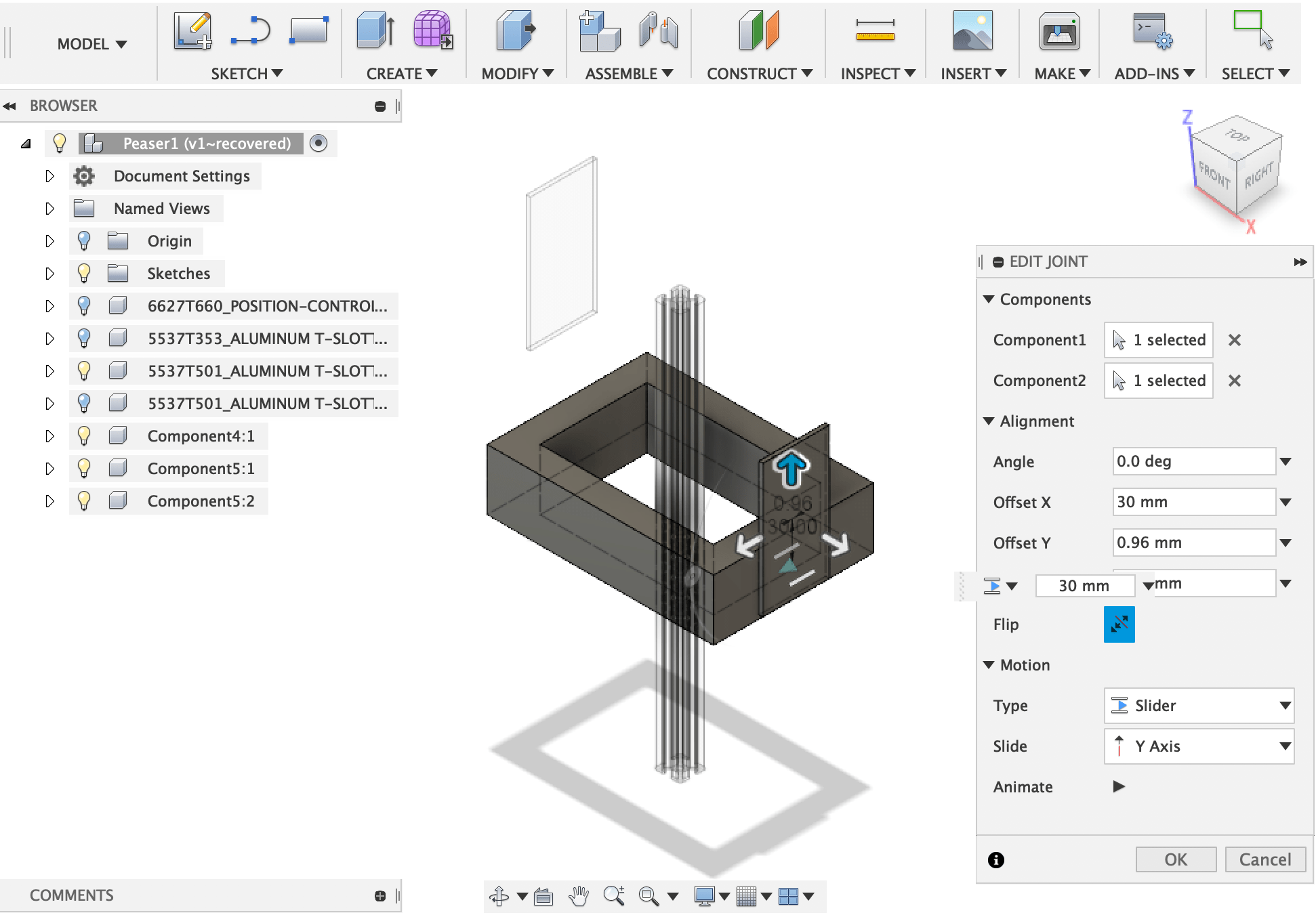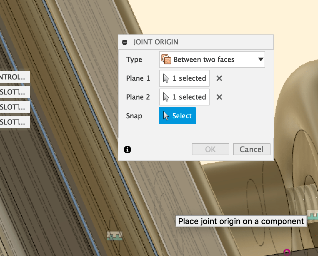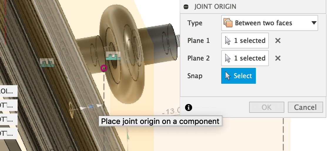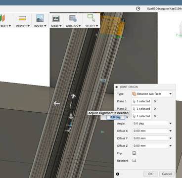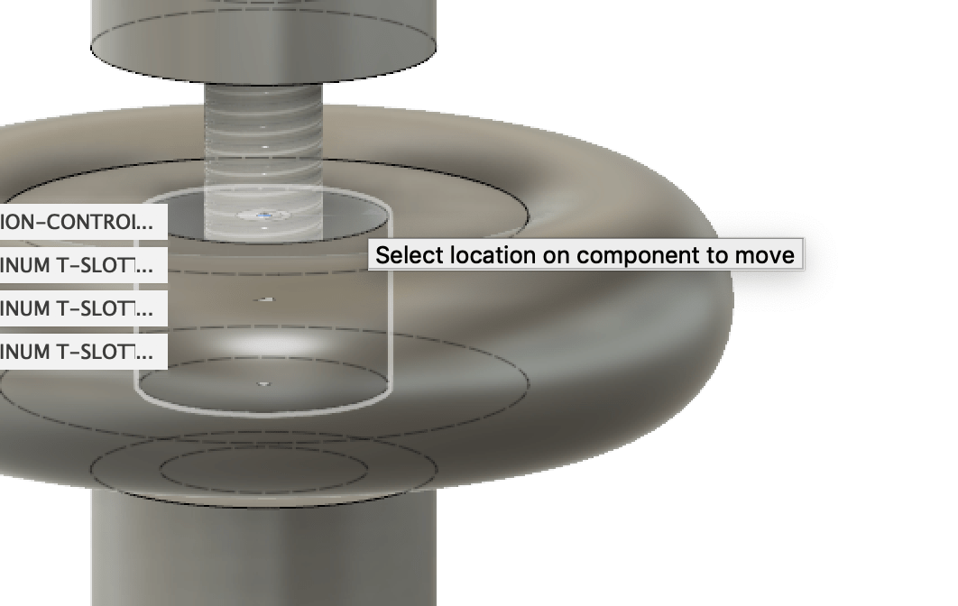 First I selected the surface of the roller, then attached it to the center of slot. However it was not able to joint. It seemed that the “joint origin” was not exist on the T slot, so I tried to created the origin at some places, then I found the following way.