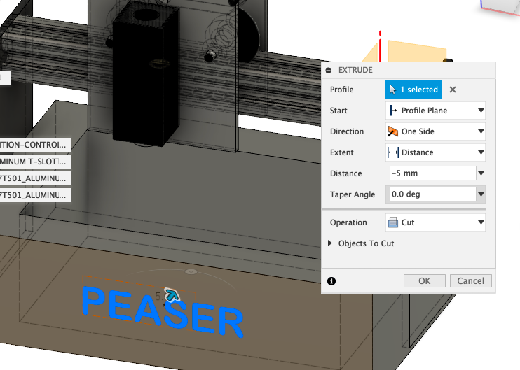 To finalize the modeling, the laser unit was attached and text “PEASER” was engraved.