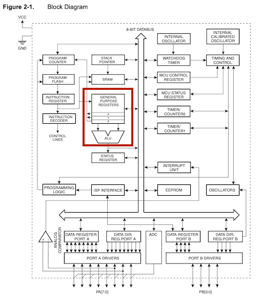 the AVR uses a Harvard architecture and the block diagram is as follows.