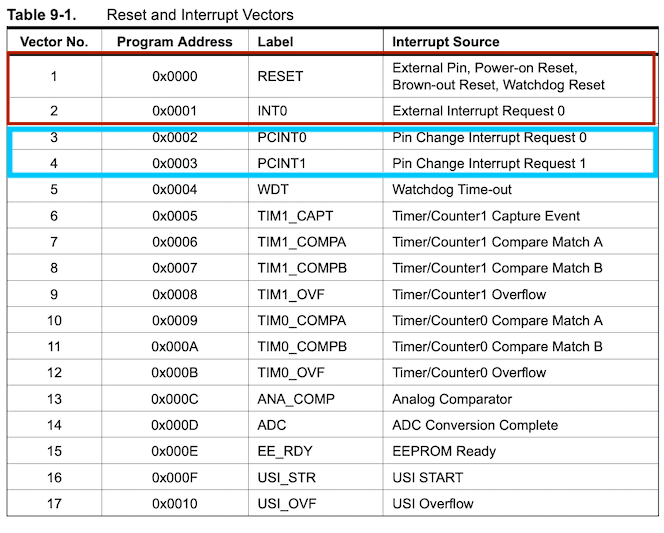 The priority of interrupts is as follows. Reset is the 1st priority, and the second is External interrupt INT0. PCINT0 and PCINT1 are Pin change interrupt.