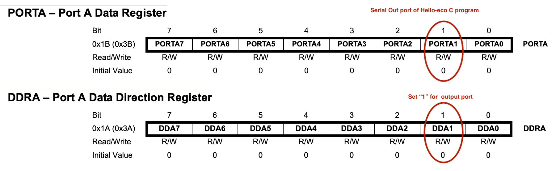 To initialize an output pin, set the direction with DDRA, then set the data to Data register.