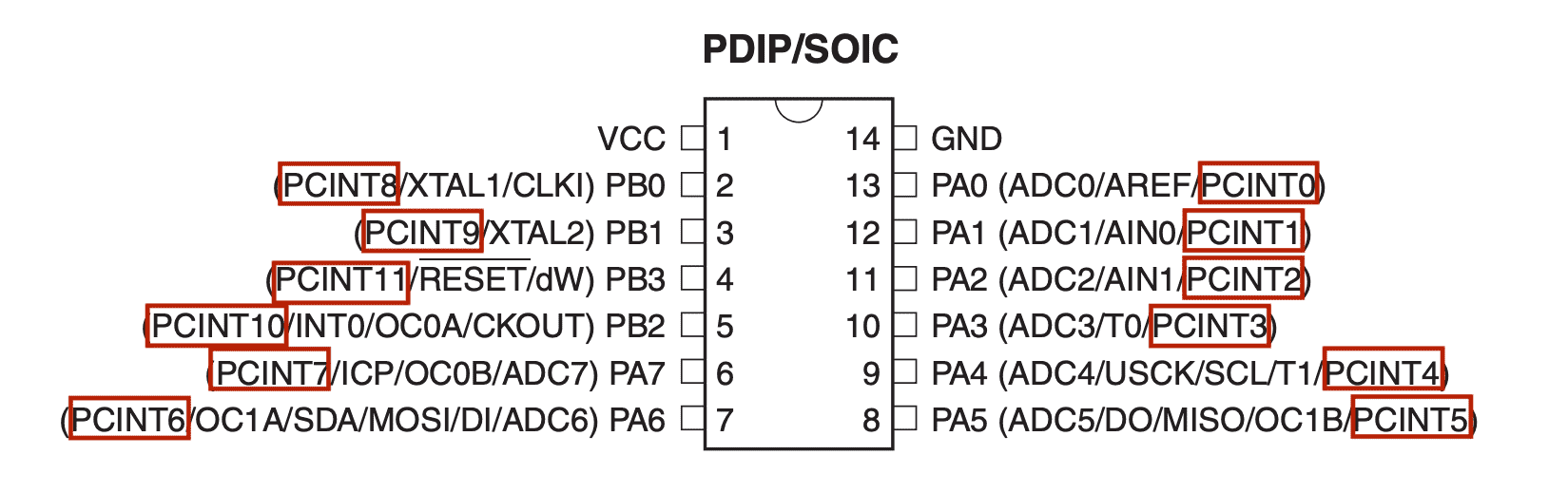 It is able to use all PA/PB port pins as interrupt PCINTxx.