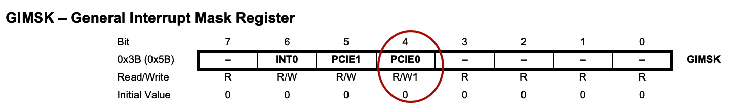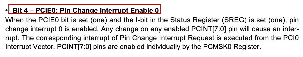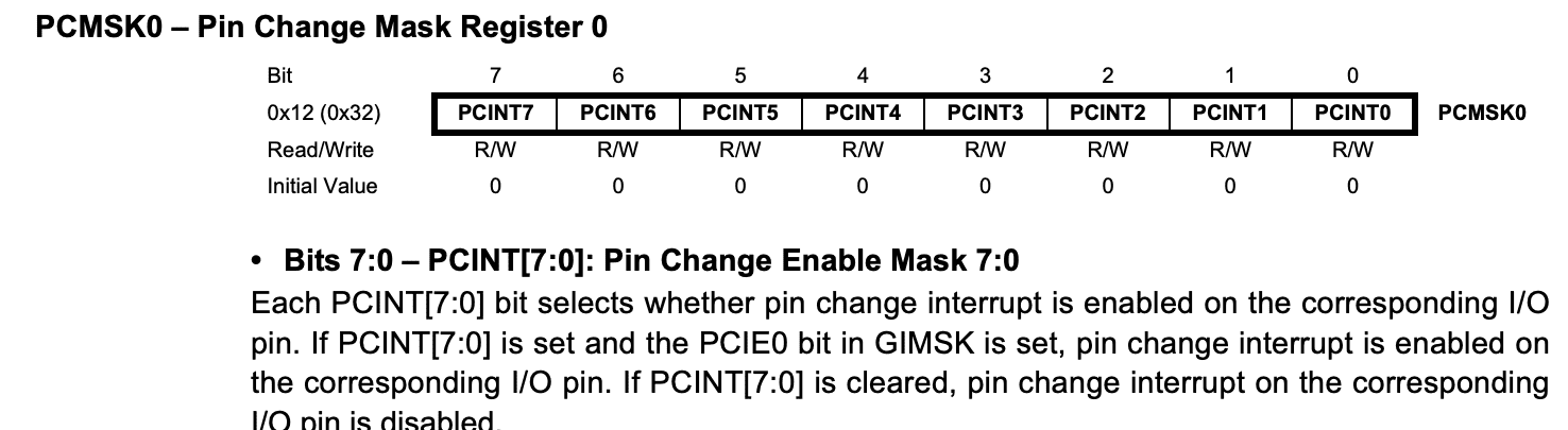 #define serial_interrupt (1 << PCIE0) #define serial_interrupt_pin (1 << PCINT0) // set up pin change interrupt on input pin // set(GIMSK, serial_interrupt); set (PCMSK0, serial_interrupt_pin); sei();