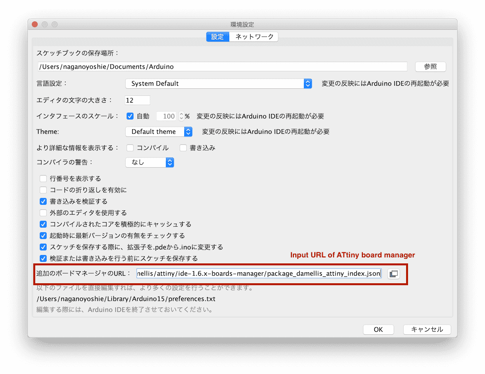 Open preference then paste the following URL into the field and click OK https://raw.githubusercontent.com/damellis/attiny/ide-1.6.x-boards-manager/package_damellis_attiny_index.json