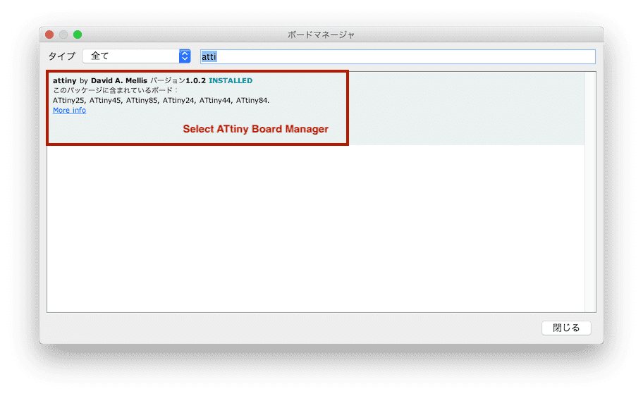 - install the ATtiny support using the built-in boards manager.
