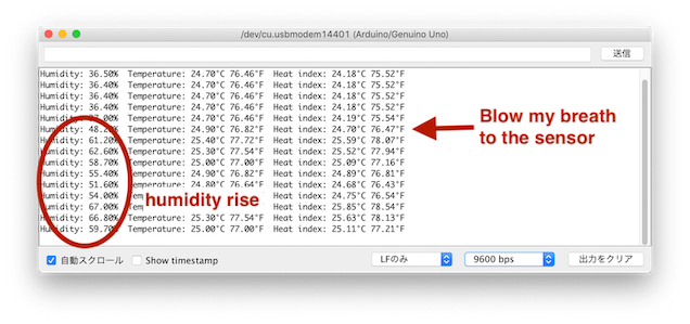 Humidity and temperature were displayed in the serial monitor of Arduino IDE. I tested the change of the humidity with my breath.