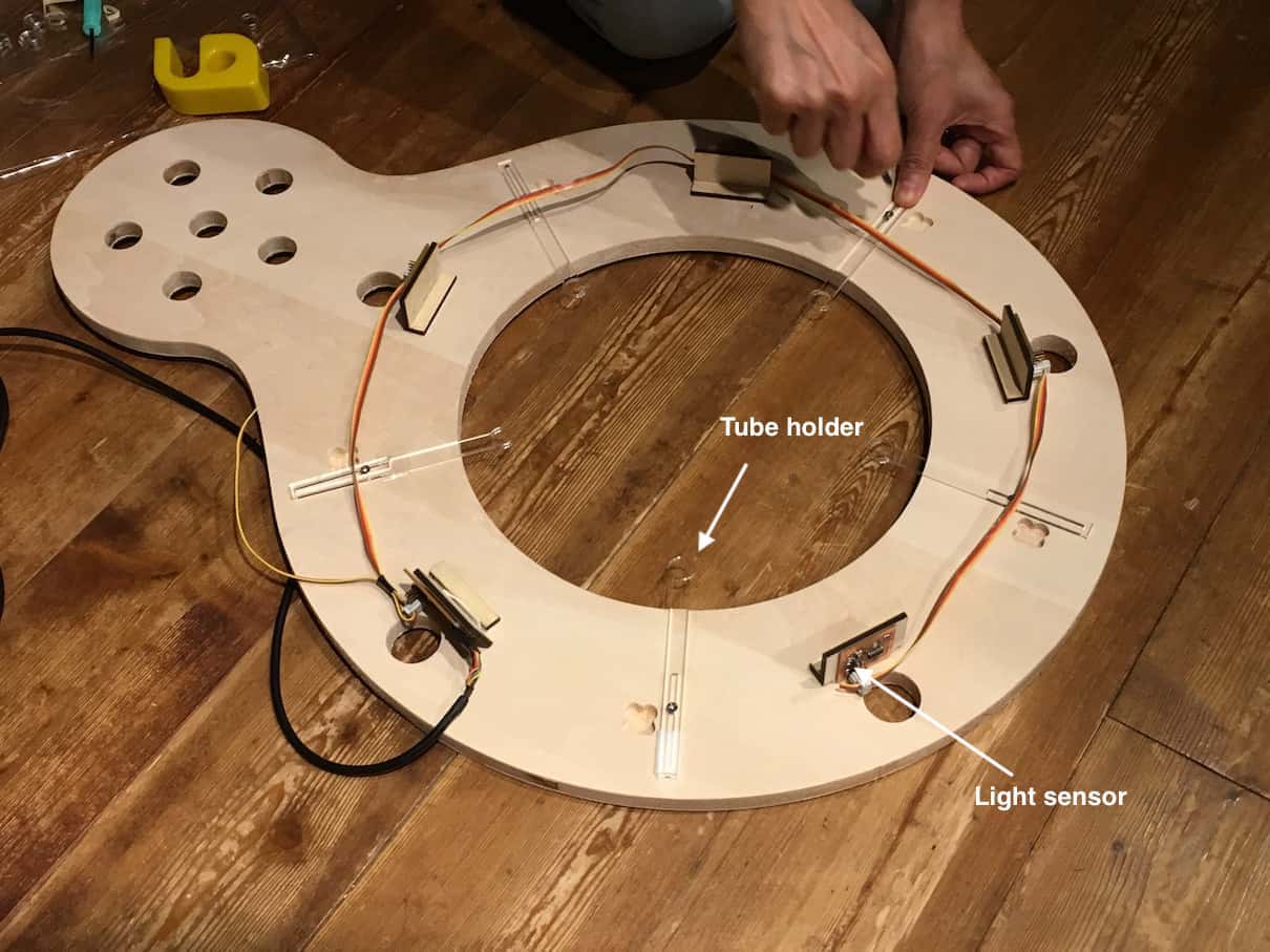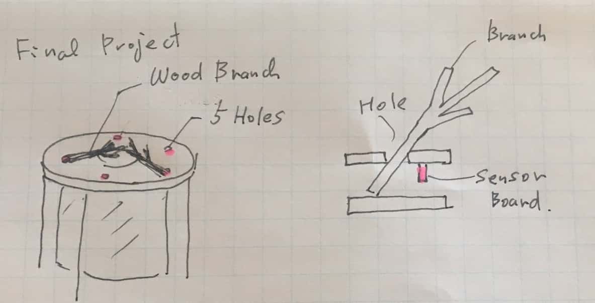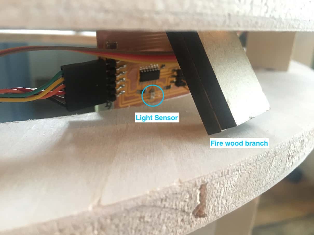 Light sensors were used to detect user interaction. When a user put a fire wood branch into a hole of the table I created at week 8, then the output of the mist changes accordingly.