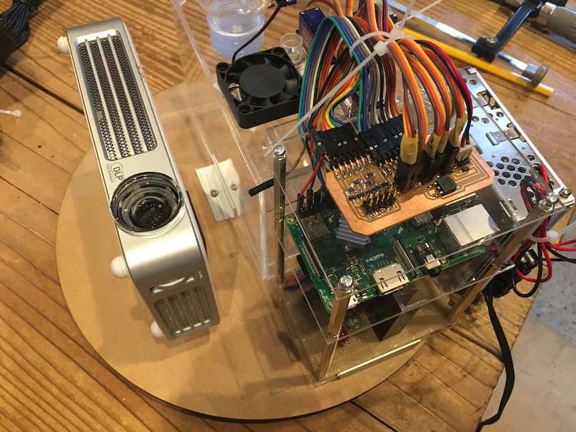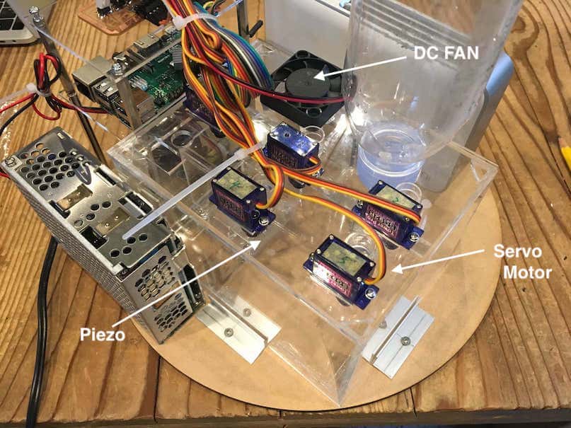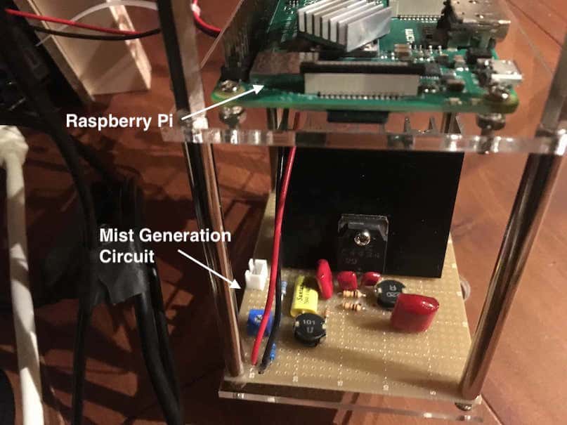 MOSFETs for DC fan is placed on the board. The Raspberry pi control blows the generated mist into tubes.