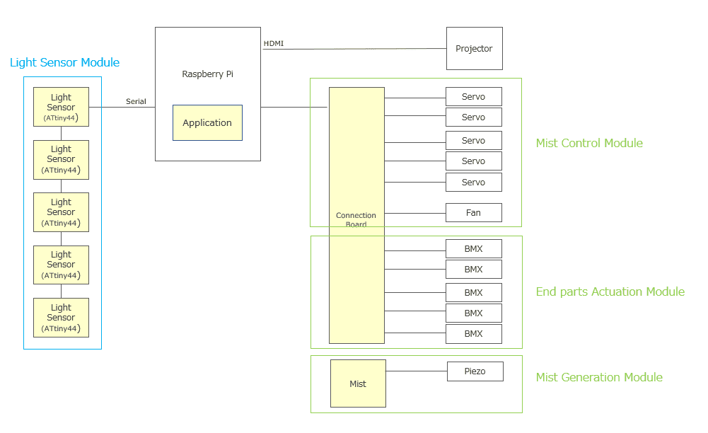 - Electronic design and production for Light sensor boards (with ATtiny44), mist generation board and connection board