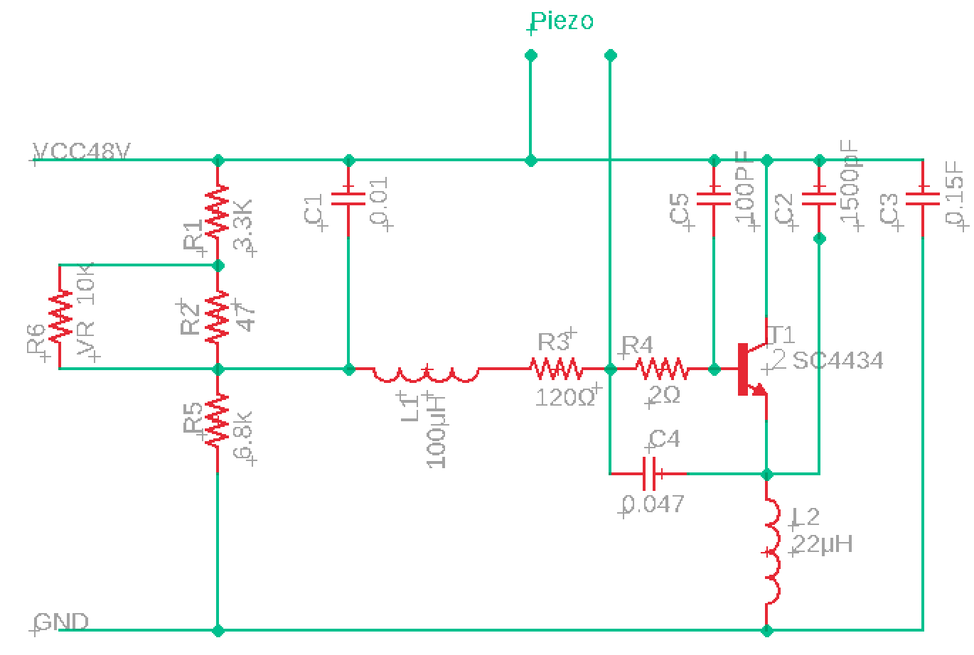 I encountered a problem of transistor. As I could not get same parts as the original circuit, I used 2SC3851 (data sheet:) first. It vibrated when no water, but when water was poured, the vibration stopped with water load. It seemed that over current flowed because the current of inductance changed from AC to DC. The inductance didn’t work as resistance. So I tried other transistors with HW instructor’s advice, then I chose 2SC4434. It worked very stable even when water was poured and adequate mist was generated with 48V power supply. The transistor generated much heat, so big heat sink was attached at the back of transistor.