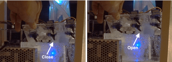 I used servo motor to open/close the mist tube. But it was really noisy mechanical sound in the silent room. Need research about silent mechanical control. When I played a back ground music of bonfire beside the application, then the noisy mechanical servo sound changed to the sound of small firewood explosion. Combining BGM and /or sound effects may be interesting. -