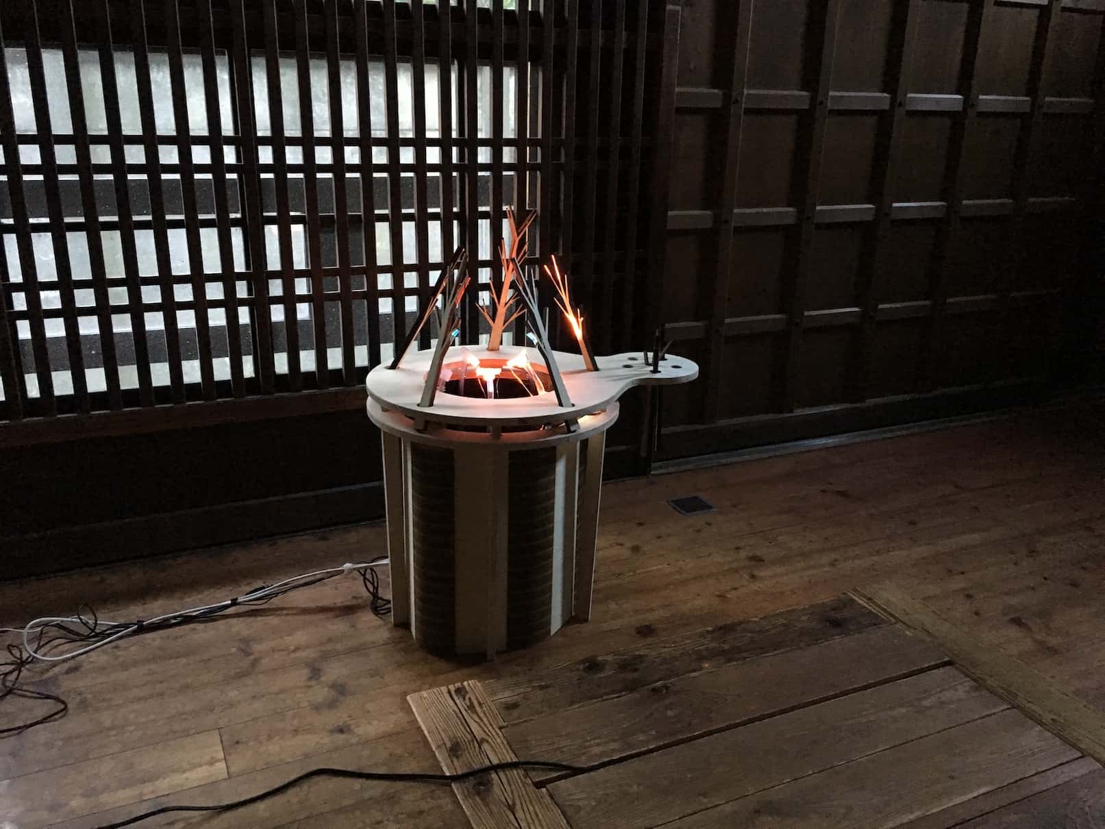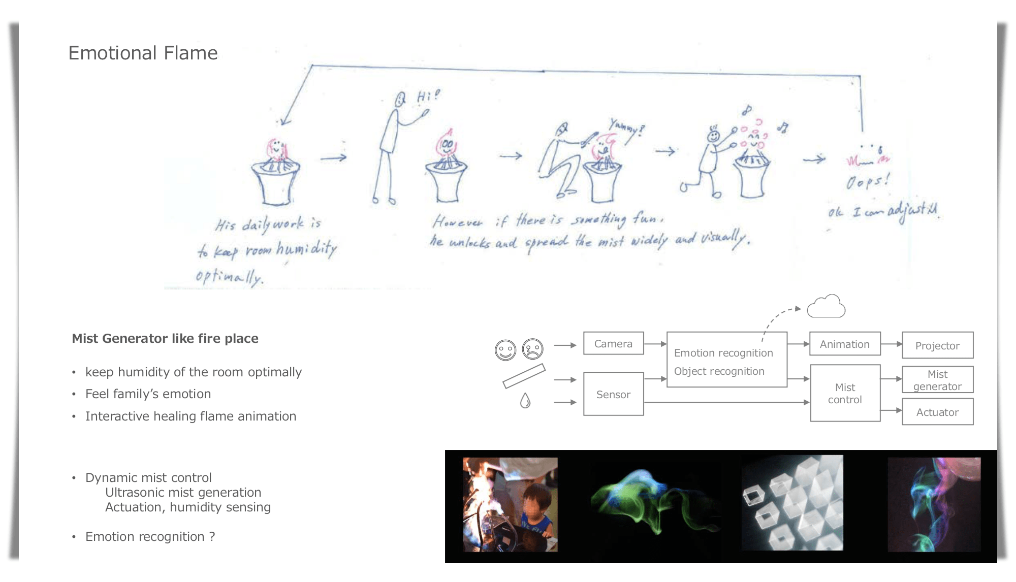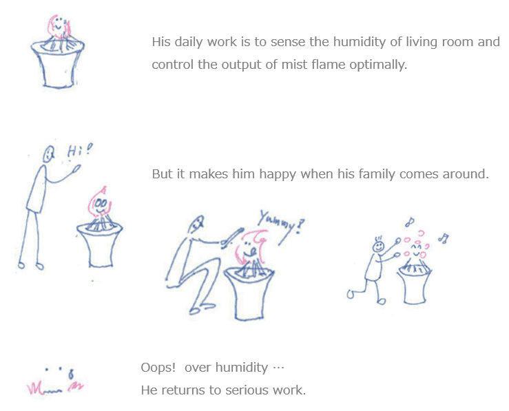 In Japan, humidifiers are very common in order to keep the room comfortable. The FLO is an interactive fireplace humidifier. The flame is generated by ultrasonic mist and is not hot. So even children can play by touching it. When you put fire wood, the size of flame will change accordingly. The natural flow of flame makes you feel comfortable and healed.