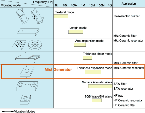 I used Piezoelectric Ceramics to generate mist. Piezoelectric ceramics are used in a variety of applications from speakers to sensors. It will expand or contract when subjected to a voltage, and generate a voltage when subjected to a pressure. The table below is the vibration modes of Piezoelectric ceramics referenced from Description of Piezoelectric Ceramics. The frequency of piezoelectric ceramics I used for FLO is 1.7MHz. So it corresponds to the red rectangle part, “Thickness expansion vibration” mode. It means that the vibration in the thickness direction of a thin plate.