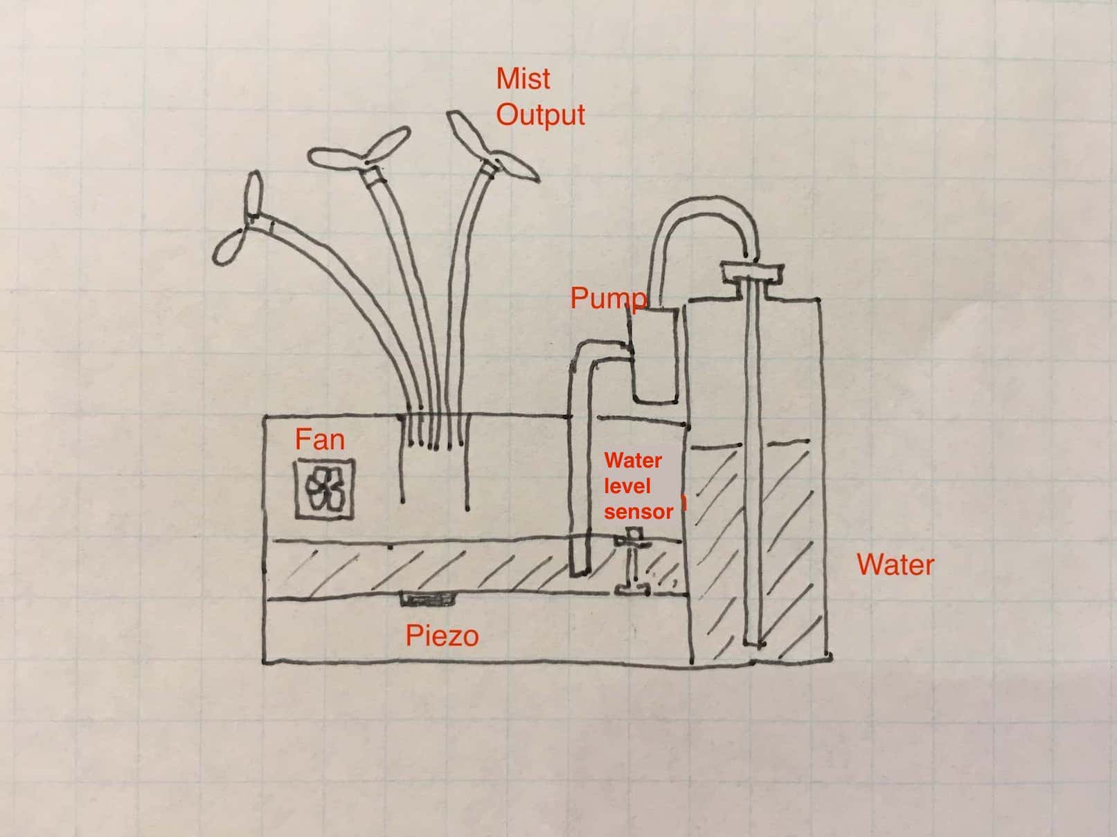 I made a rough enclosure using acrylic board. And added a DC fan to push out the mist through the tubes. The spec of the piezo part is 1.7MHz, and the voltage of the circuit is 24V. It worked fine as follows.