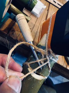 The nodes along the bamboo rods were also shaved down with a knife and sanded to make smoother. The rods were scorched to release oils and make a nice surface finish as well as promote hardening…