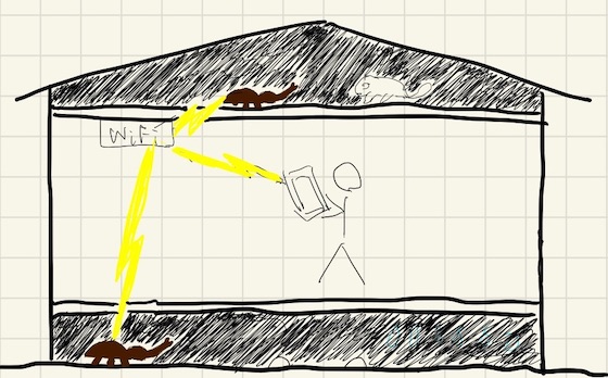 Third is used for sensing the place where users cannot enter (under the floor, above the ceiling, somewhere dangerous zone etc…). The robot have some sensors that measure surrounding conditions or detect objects or creatures for extermination. Users control the robot from their own PC via Wi-Fi.
