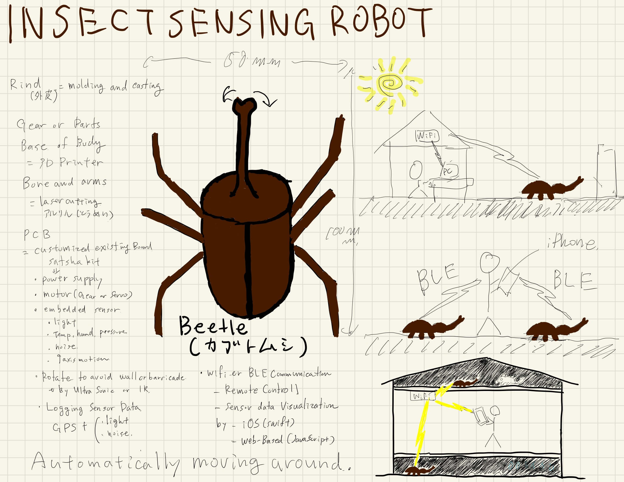 My potential final project is titled as “INSECT SENSING ROBOT THAT MEASURING THE NATURE”. When I decided to join Fab Academy, there are two things I want to make. One is a robot that is automatically moving around and looks something like a insects. Another is portable data logger that have multiple sensors measuring something unmeasured (means measuiring something new aspects of our daily lives, our environment or our society). The sketch shows combined idea of those I want to make. That is insect robot that collecting data in a viewpoint of insects.