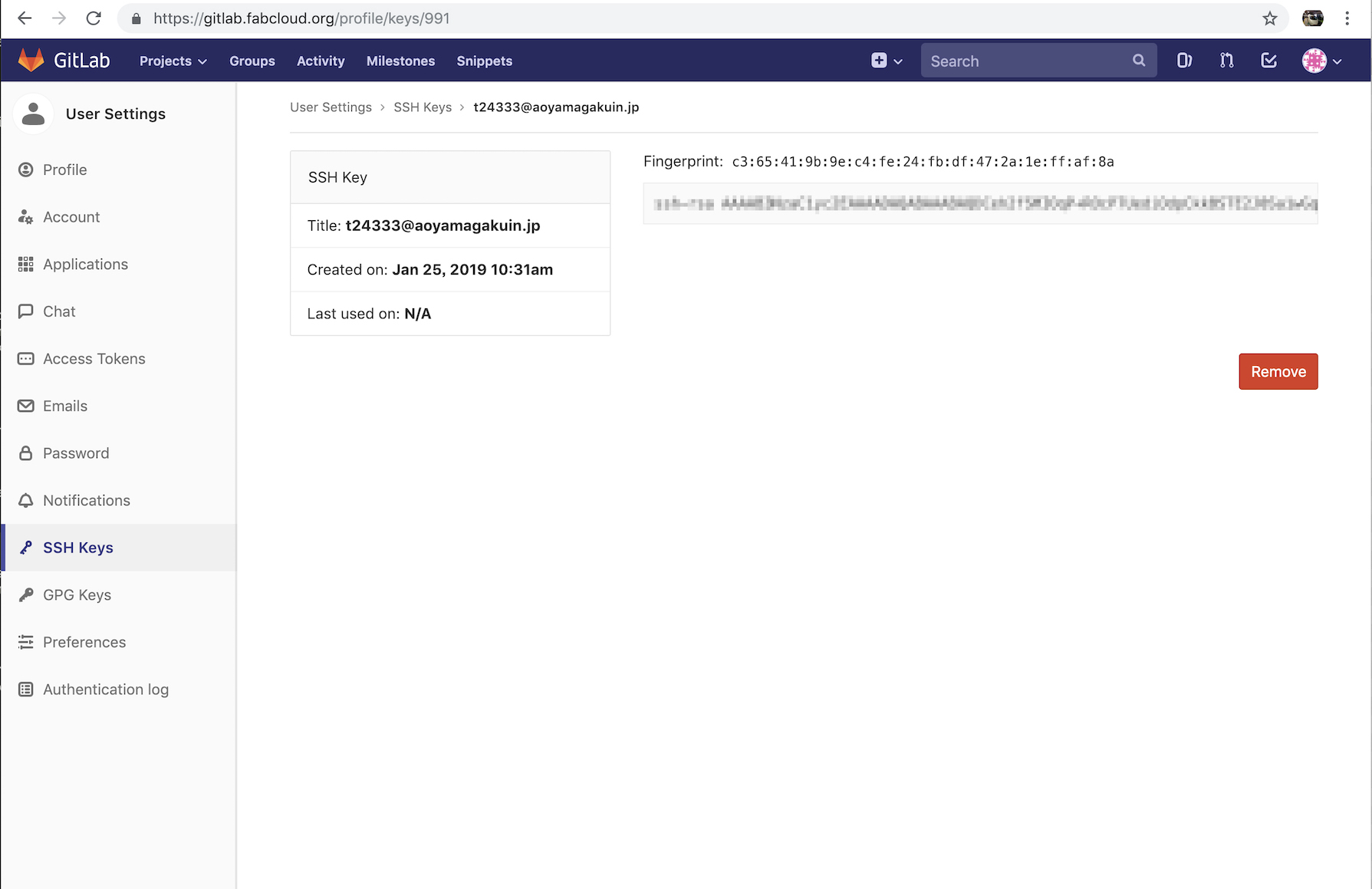$ cat fabcloud.rsa.pub ssh-rsa ... (sorry, I would like to hide key info itself) ... t24333@aoyamagakuin.jp