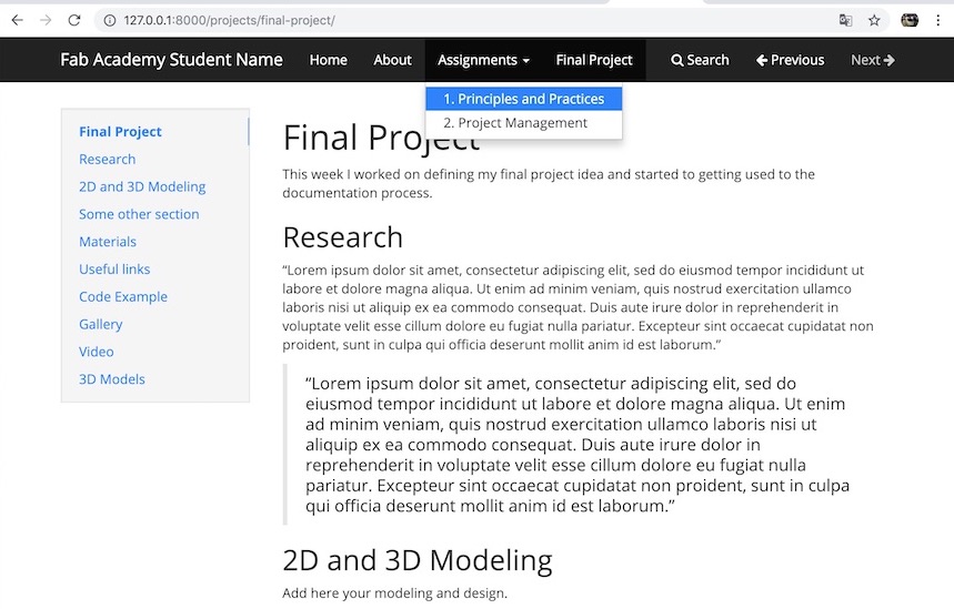 Then, I can see navigation bar was changed. I confirmed that only week 1 (Principles and Practices) and week 2 (Project Management) are listed in the assignment menu.