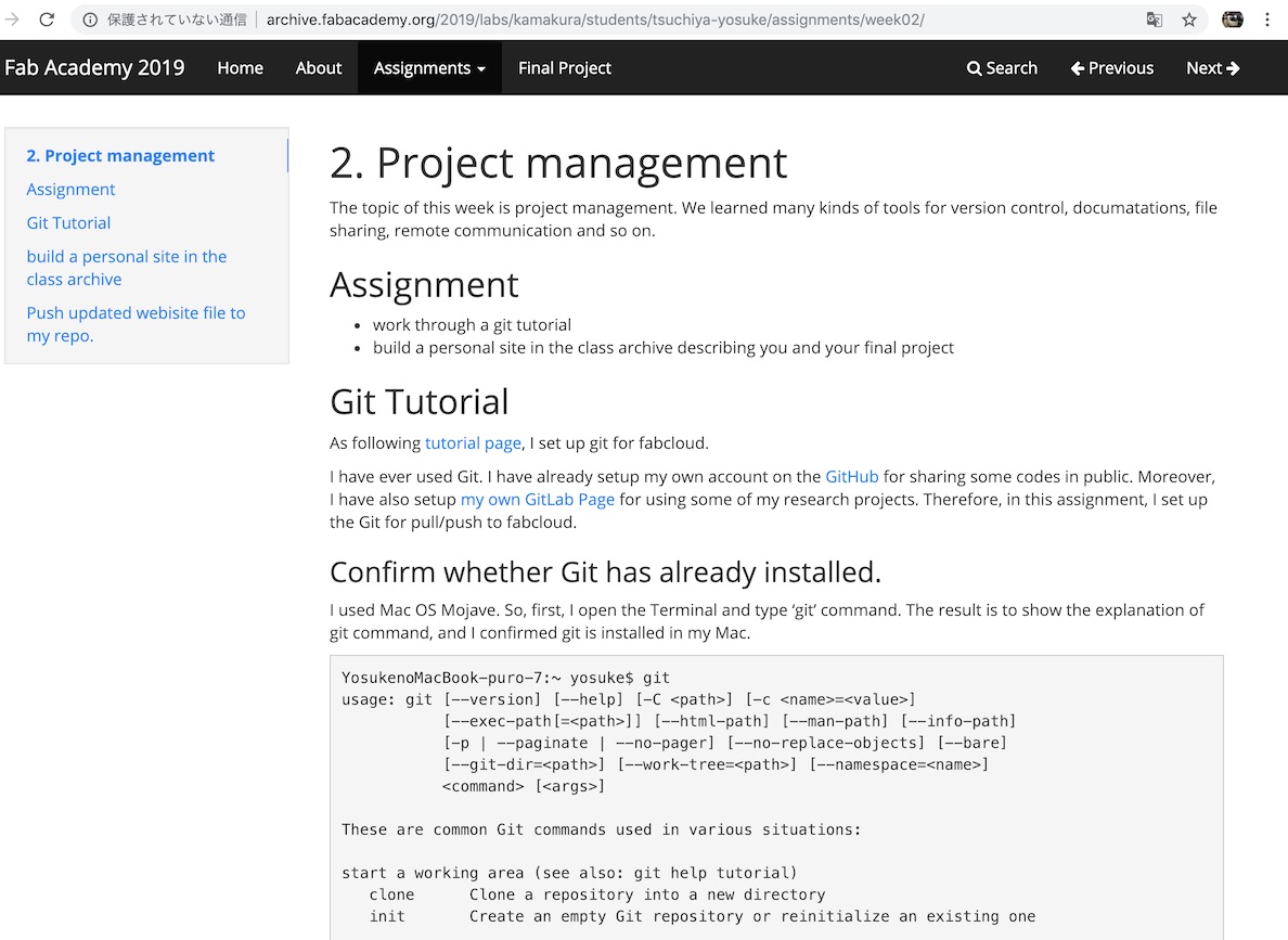 To check whether git works on my Mac, I tried to clone my fabacademy repository. First, I created a new folder for fabacademy assignments on my home folder with using “mkdir” command. Then I moved to the folder by cd command.