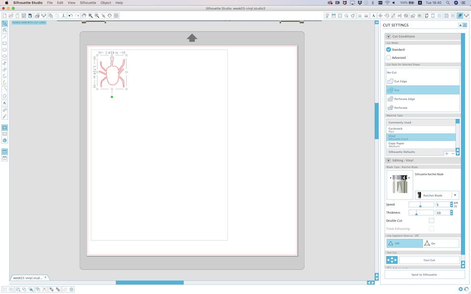 Setting “Silhuette Ratchet Blade” parameter in “3” (the same with the real blade parameter), then push “Send to Silhuette” to start cutting.