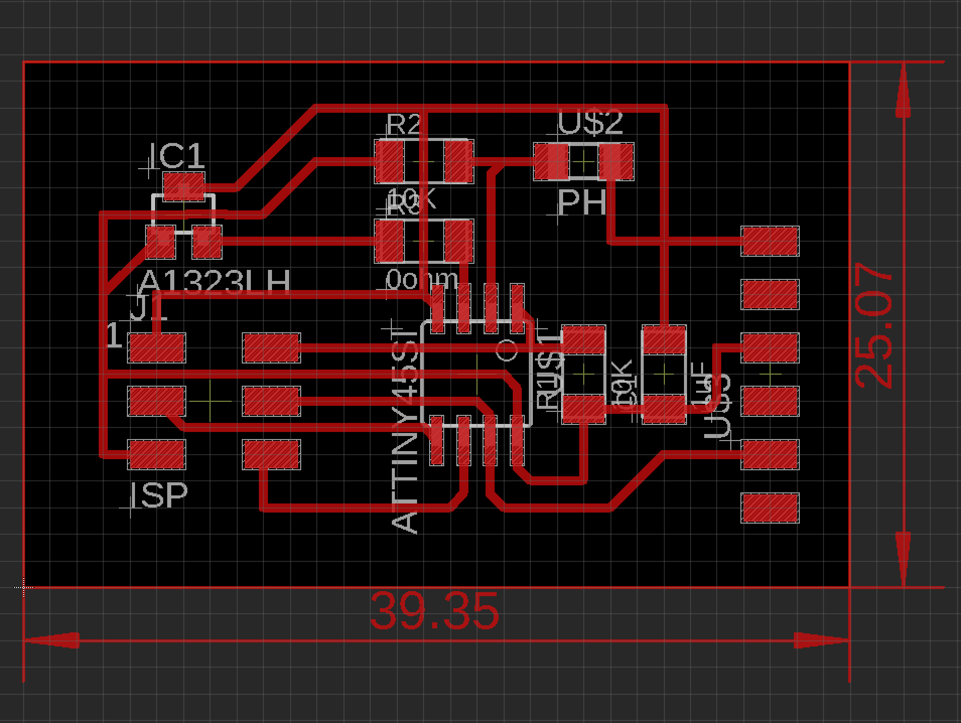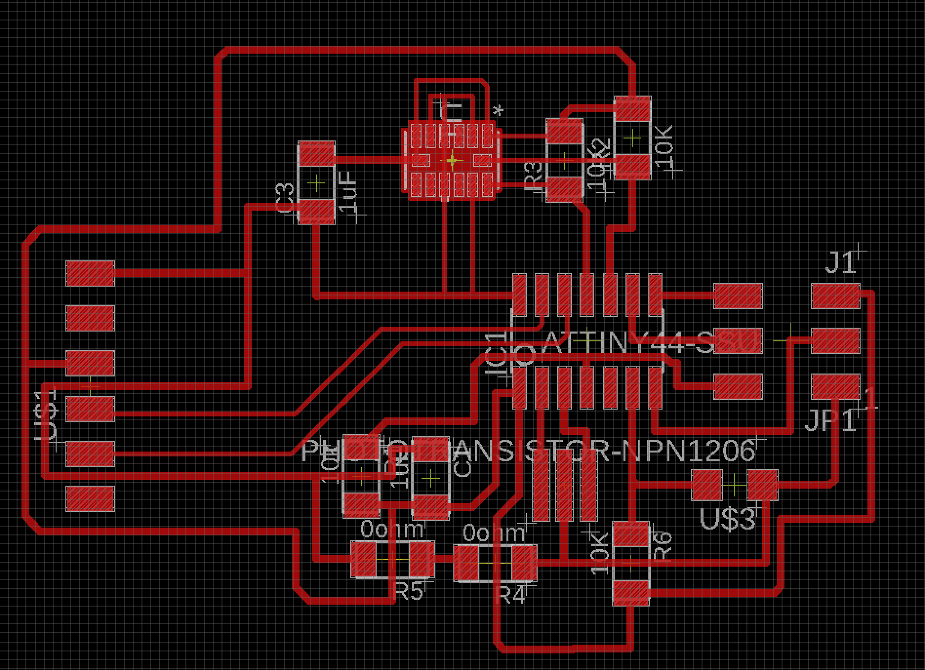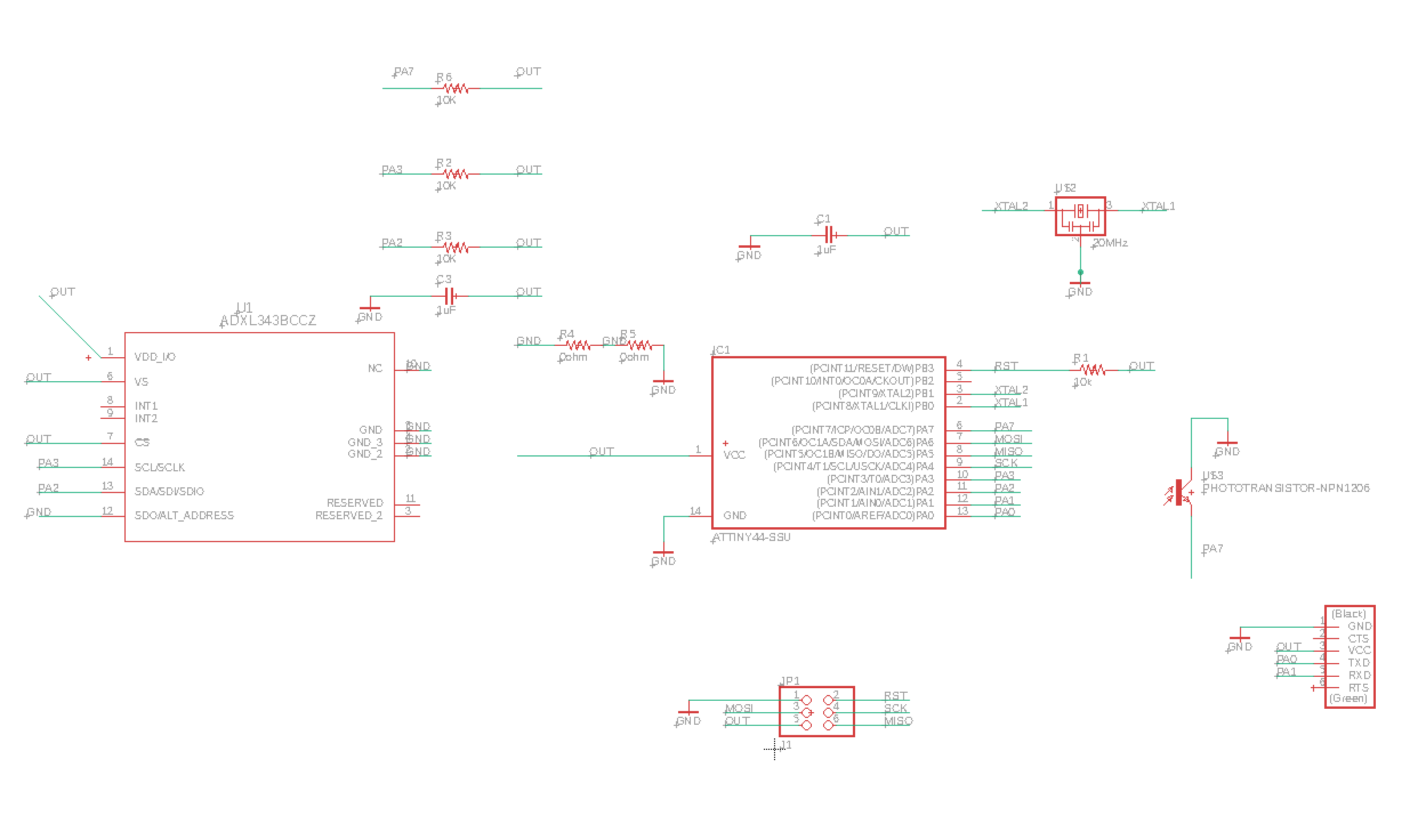 In these sample boards, PB4 in ATTiny45 is connected to Hall Effect and PB3 is connected to photo-transistor. Here is the shecma of the 2nd board by Eagle.