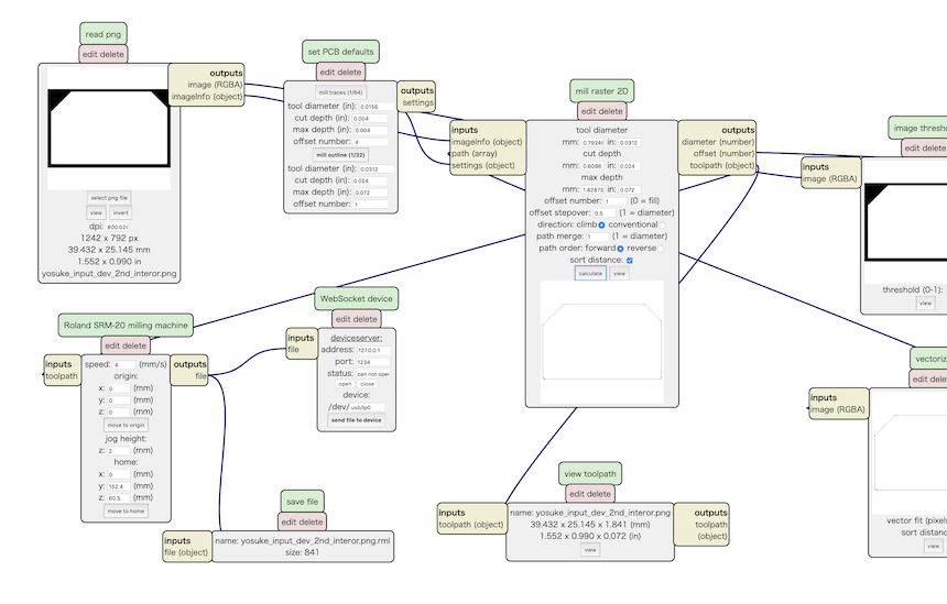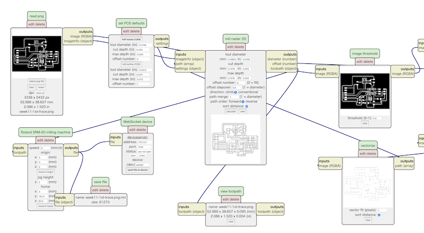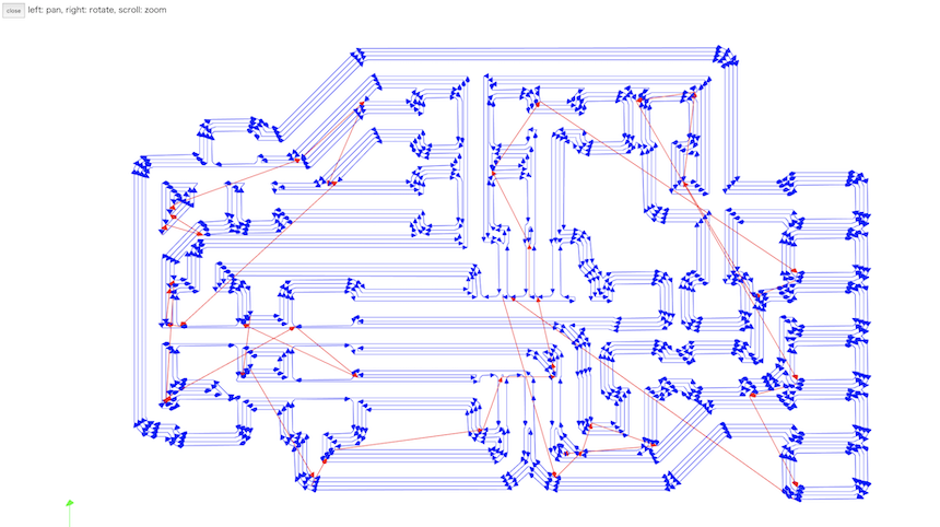 Here is the view of the path for milling by Roland SRM-20. From the experience of week 7 (Electronics Design) assignment, I checked the path carefully before moving to milling part. That looks fine (no pathes that are not overlapped.)