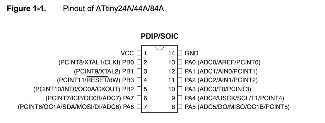 The following figure show the pin configuration of ATTiny 44.