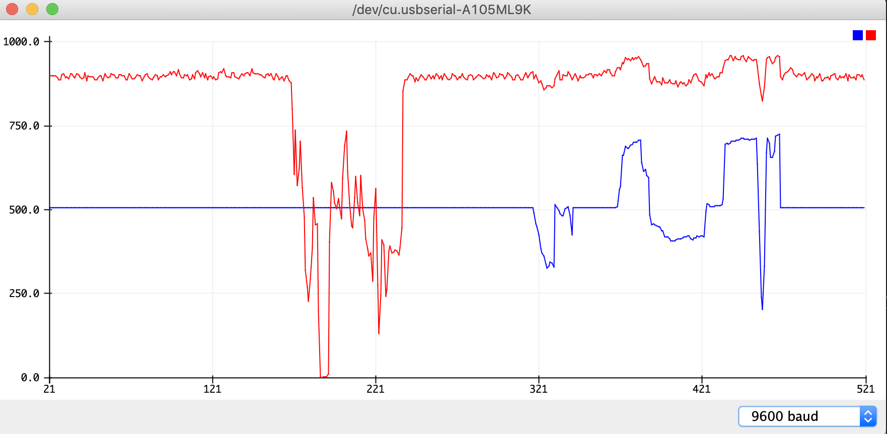 Then, uploaded the sketch to the board, and opened the “serial plotter”, that show values of analogReaded data on the line chart. That works well.