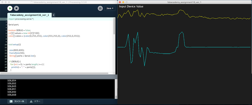 First, I wrote a simple Processing program in order to check the program that receive sensor data via serial communciation. Here is the code of the program.